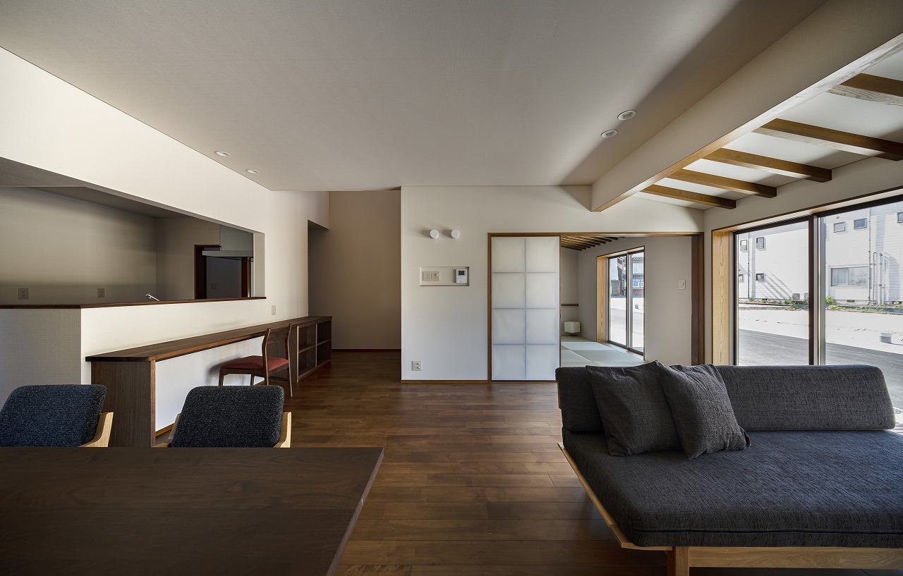 モデルハウスの建つ松江城堀川沿いの塩見縄手は松江で最も城下町らしいたたずまいを残している通りであり、 松江市の伝統美観地区にも指定されている歴史ある地区です。古い街並が残る地域性を反映し、現代版の和風住宅。「歴史ある街並みとの共生」をコンセプトにしたモデルハウス。